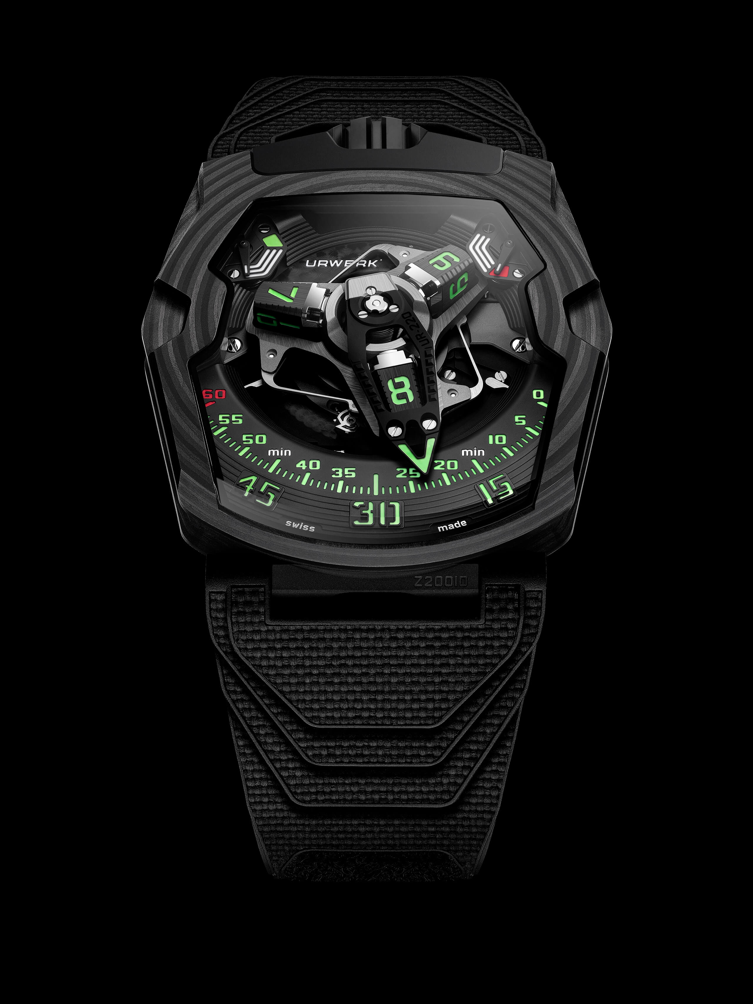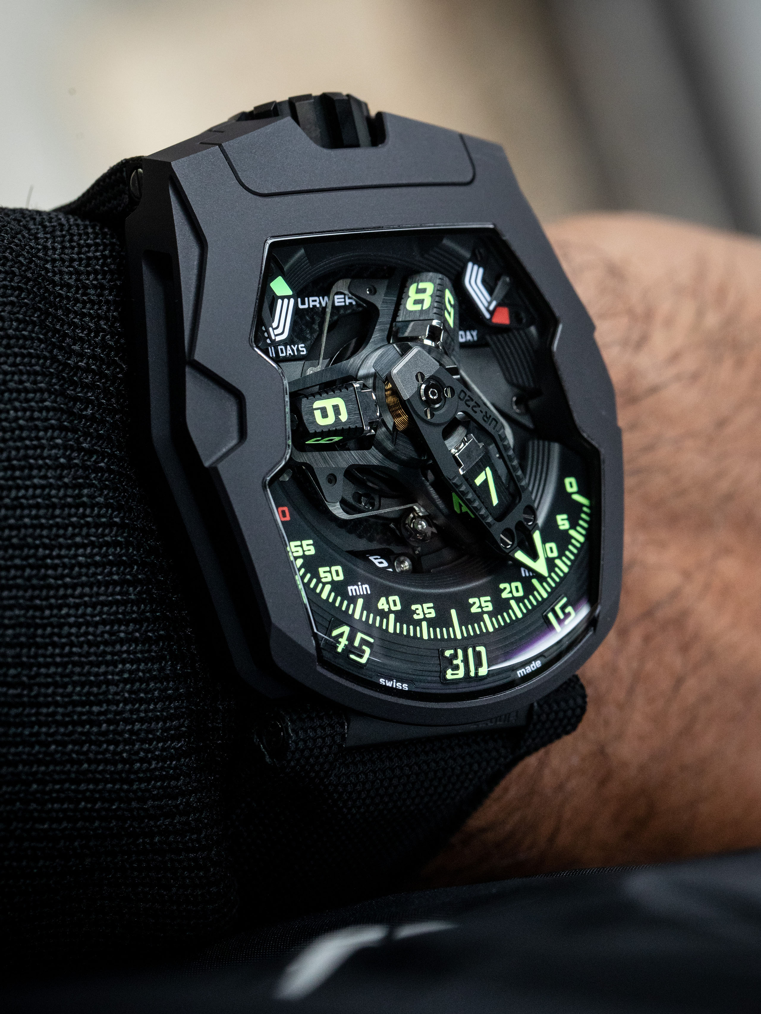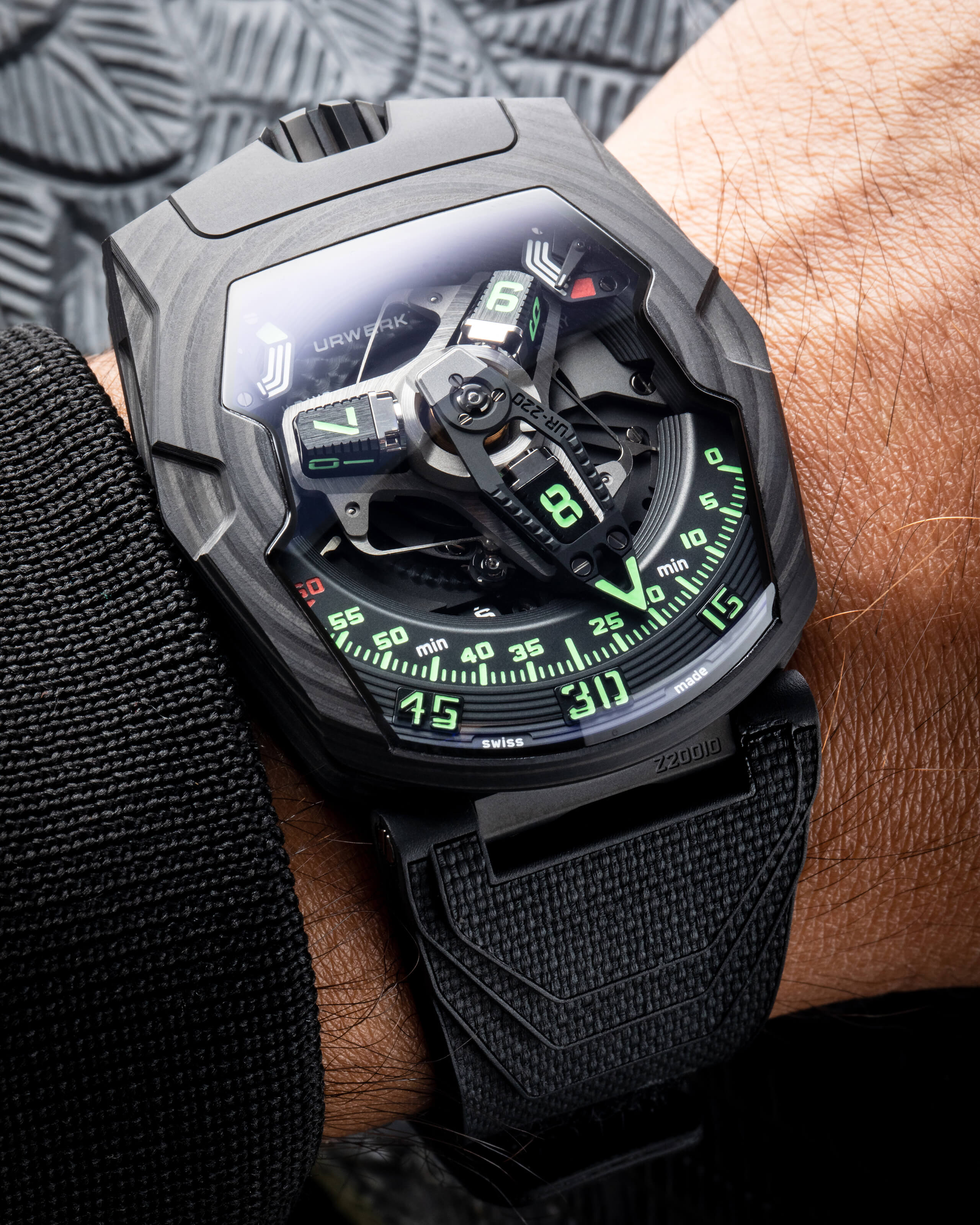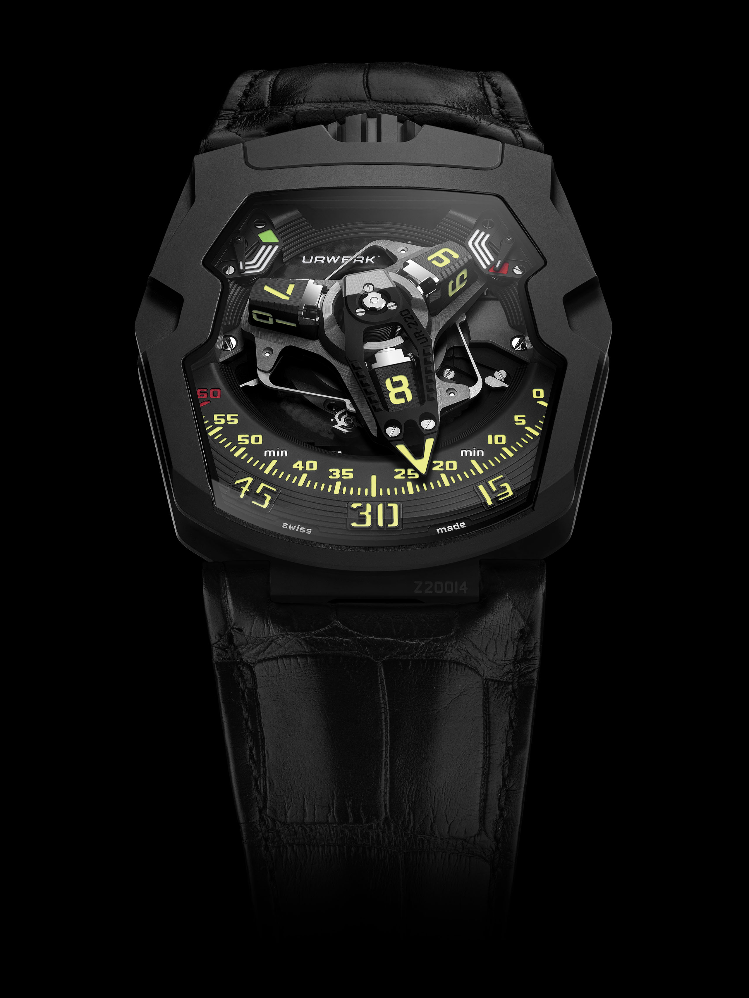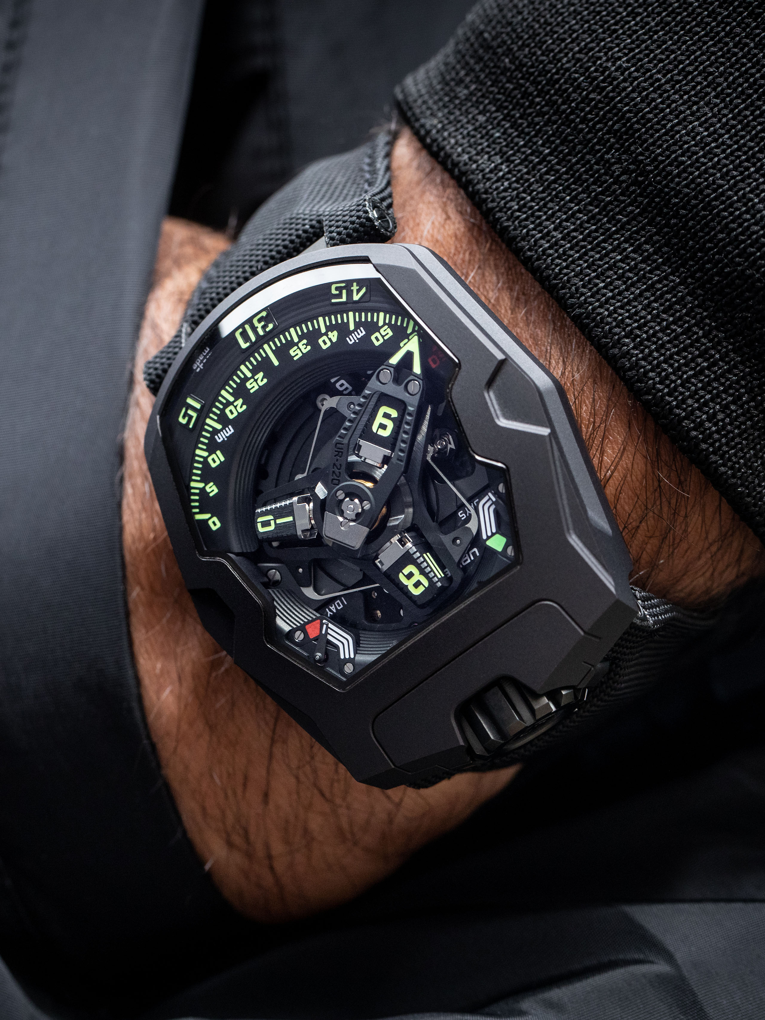 The UR-220 features a high-tech, oversized, three-dimensional retrograde minute hand. It encloses the hour satellite and indicates the time as it transverses the 0-to-60-minute scale. Then in less than 0.1 of a second the hand flies back to dock with the next hour satellite.