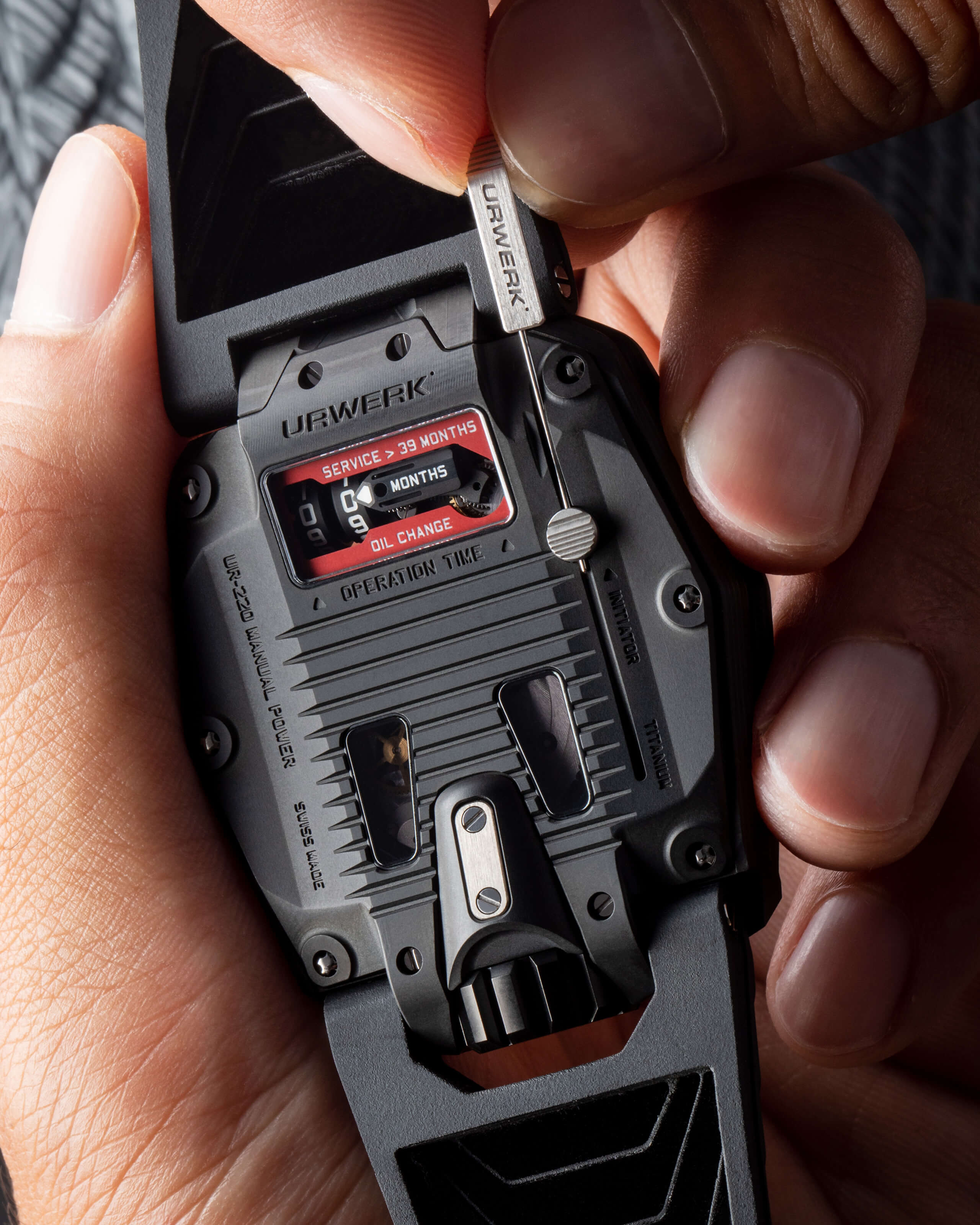 With its manually wound movement and control board on its back, the UR-220 goes back to URWERK’s earlier technologies in a case that is sleeker, more ergonomic and as stunning as ever. One exceptional feature is the return of the Oil Change indicator in a new guise. A limited production of 15 pieces every year!
